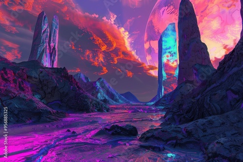 A surreal alien landscape with pink and blue light