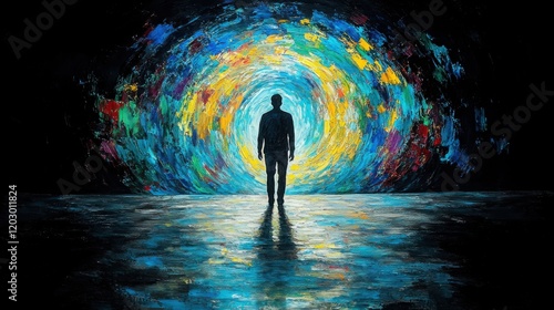 A surreal cosmic landscape featuring a glowing human figure dissolving into swirling streams of vibrant colors and fractal patterns that merge into a galaxy of imagination and dreams Hyper-detailed