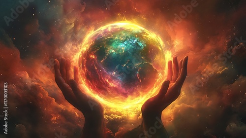 A surreal depiction of human hands forming a glowing sphere that represents the Earth, vibrant rainbow-like colors emanating outward, soft shadow effects, dreamy and mystical atmosphere,