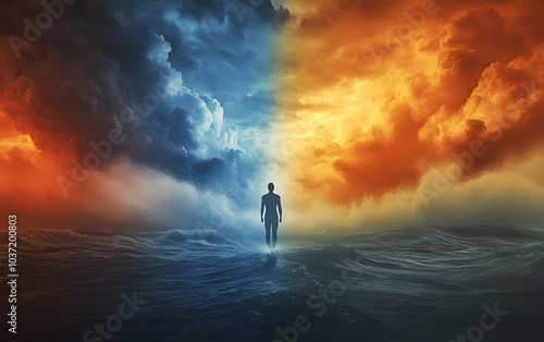 A surreal representation of duality with a figure standing between contrasting skies of blue and red, symbolizing conflict and choice.