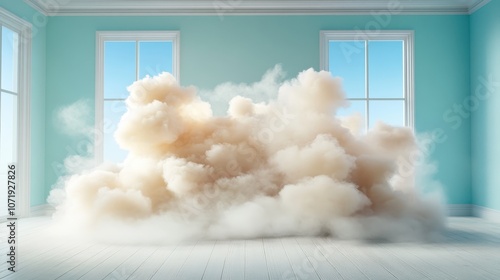 A surreal scene of fluffy clouds occupying a serene pastel-colored room, evoking a calm yet dreamlike atmosphere with soft light illuminating the space.