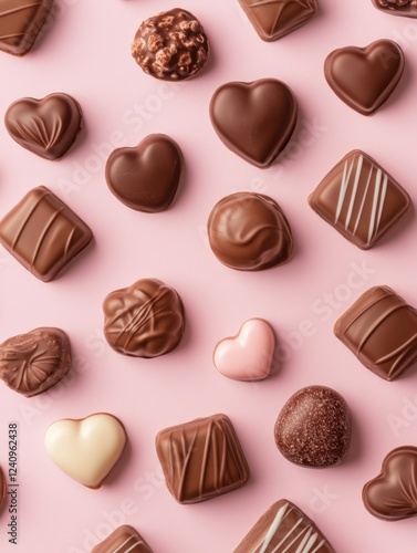 A Symphony of Hearts: A Delightful Collection of Exquisite Chocolate Hearts, Beautifully Displayed on a Pastel Pink Surface, Creating a Scene of Pure Romance and Sweet Indulgence