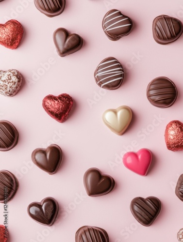 A Symphony of Hearts: A Delightful Collection of Exquisite Chocolate Hearts, Beautifully Displayed on a Pastel Pink Surface, Creating a Scene of Pure Romance and Sweet Indulgence