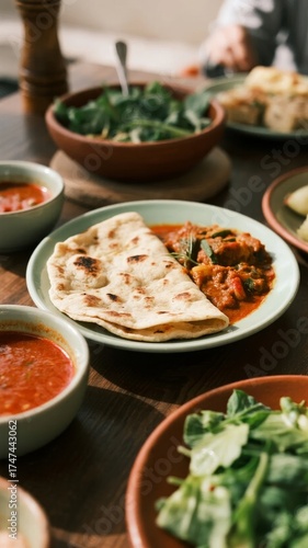 A table set with Indian cuisine featuring flatbread, curry, and fresh salads in ceramic bowls.