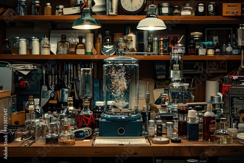 A Tabletop Still Life with a Glass Jar Filled with a Colorful Mixture and Surrounded by Various Bottles and Other Objects