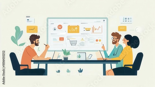 A team collaborating in a workspace, analyzing data and graphs on a large screen, promoting teamwork and innovation.