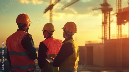 A team of engineers in safety gear collaborating on a building site, demonstrating teamwork in action.