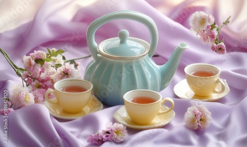 A teapot and three cups are on a table with flowers