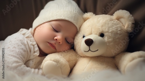 A teddy bear cuddles a sleeping baby in a cozy bed