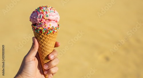 A tempting, hand-held ice cream cone overflowing with delightful, rainbow-sprinkled scoops, a perfect treat for a bright sunny day.