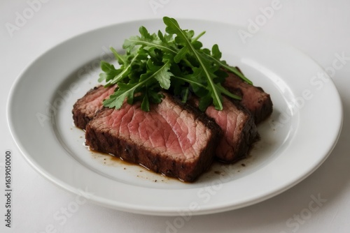 A Tender Steak with Fresh Arugula on a White Plate