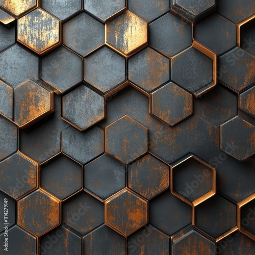 A textured wall featuring a modern hexagonal pattern in shades of black and bronze, creating a striking geometric design, This image is ideal for use in interior design, architecture