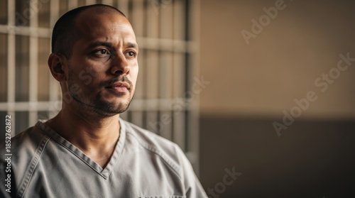A thoughtful man in prison attire gazes pensively, highlighting themes of reflection and confinement against a backdrop of bars.