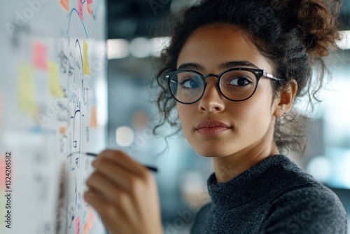 A thoughtful young woman with glasses engages in a brainstorming session, capturing her ideas on a whiteboard filled with sketches and colorful notes, embodying innovation.