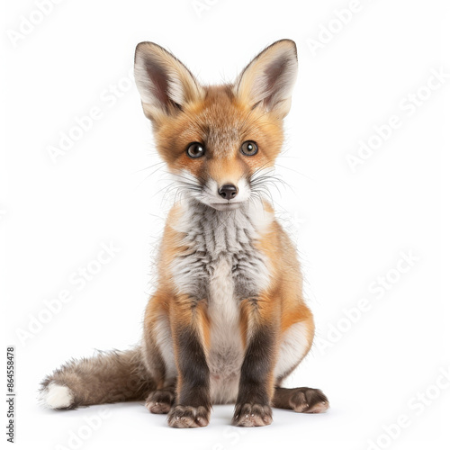A tiny baby fox with a bushy tail and big ears, sitting and looking curious, isolated on white background