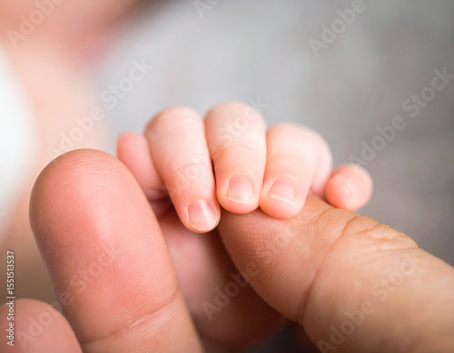 A tiny baby's hand gently grasping an adult's finger, showing connection.