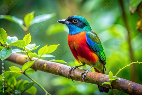 a tiny finch on a branch with leaves on background created with generative AI technology