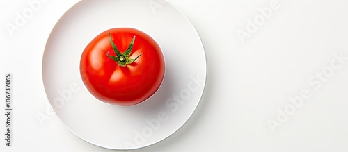 A top down view of a solitary red tomato resting on a pristine white plate with a plain white background There is ample space for adding text or captions