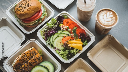 A top view of healthy takeaway food and drinks in disposable eco-friendly paper containers on a gray background. There is a salad, a panini, a Buddha bowl, fruits, coffee, and juice ai generated