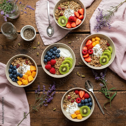 A top-down view of five delicious and healthy breakfast bowls filled with granola, yogurt, fresh berries, kiwi, and mango.