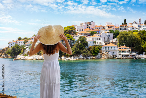 A tourist woman in a white summer dress looks at the old harbour of Skiathos Town, Sporades, Greece