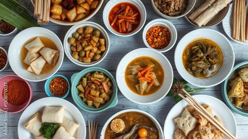 A traditional Filipino feast spread out on a wooden table showcasing dishes like adobo, sinigang, lumpia, and kare-kare, utensils, Philippines