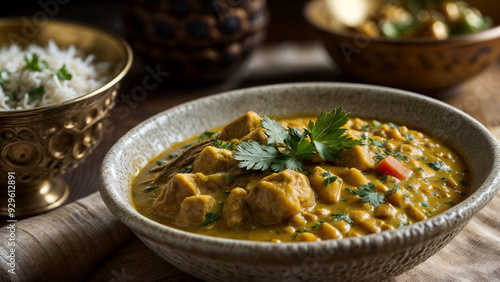 A traditional Indian meal with vibrant curry, rice, and salad served in ornate metalware, evoking a warm, homely atmosphere.