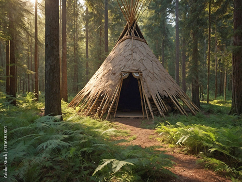 A traditional wigwam house made of wooden poles and covered with bark and woven mats stands in a peaceful forest clearing.