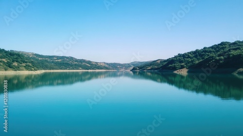 A tranquil blue sky reflected perfectly in a calm lake surrounded by hills.