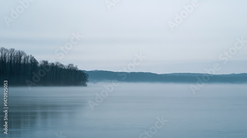 A tranquil landscape depicting a misty lake with forest present