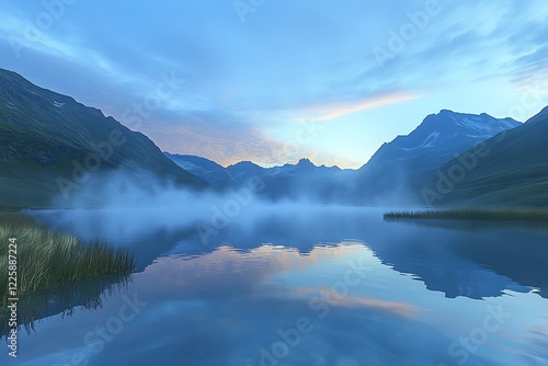 A tranquil mountain lake at dawn, with mist rising from the surface and mountains in the background.
