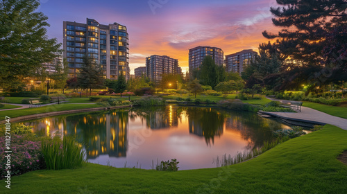 A Tranquil Park at Twilight with a Peaceful Water Pond, Surrounded by Winding Paths and Tall Trees, the Colorful Evening Sky Reflected in the Still Water, with Contemporary Apartment Buildings Towerin