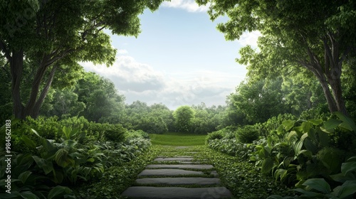A tranquil pathway leads through lush greenery, inviting exploration and a sense of peace in nature's serene environment.