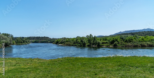 A tranquil river cuts through lush foliage under an expansive blue sky, with distant hills rolling into the horizon, embodying serene natural beauty.