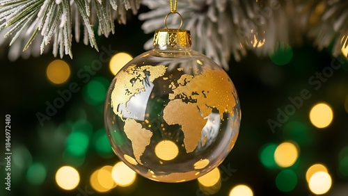 A transparent glass Christmas ornament featuring a golden world map hangs from a frosted evergreen branch with festive lights.