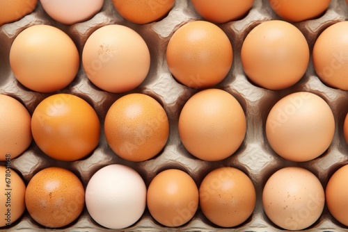 A tray of brown fresh hen's eggs on beige background. Eco-friendly egg production. Baking ingredients. Organic chicken eggs - fresh from producer. Top view. Free space for text.