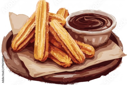 A tray of freshly fried churros coated in cinnamon sugar, served with a side of rich chocolate dipping sauce. Illustration