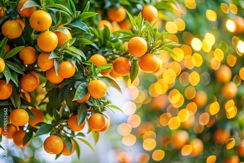 A tree with many oranges hanging from it