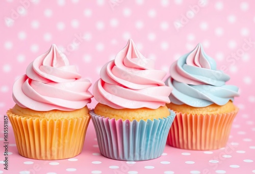 A trio of pastel cupcakes sits on a pink polka dot background, bakery, sweet
