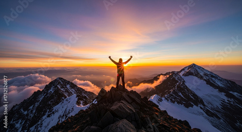 A triumphant hiker on a snowcapped mountain peak with arms raised at sunrise, celebrating success and the beauty of nature
