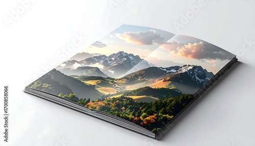 A two-page spread showcasing a breathtaking mountain landscape, rich in color and detail, with a sunrise or sunset sky, highlighting a valley nestled amidst the peaks.