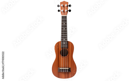 A ukulele with a wooden body and strings, resting peacefully against a backdrop of serene beauty
