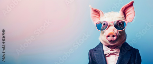 A unique and humorous digital featuring a pig wearing a smart business suit and stylish sunglasses