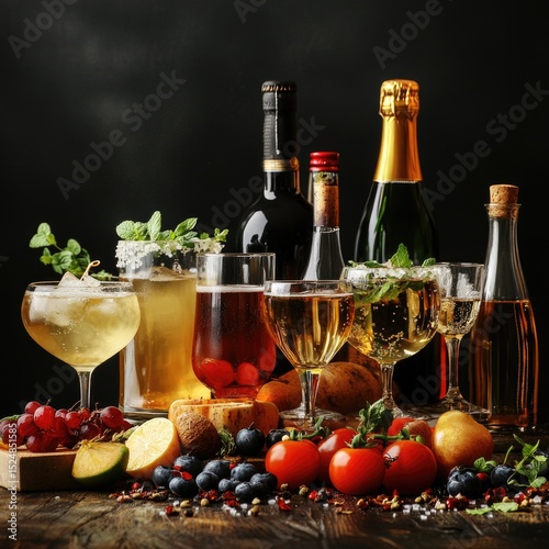 A variety of alcoholic and non-alcoholic beverages, accompanied by fresh fruits and vegetables, arranged on a rustic wooden table against a dark background
