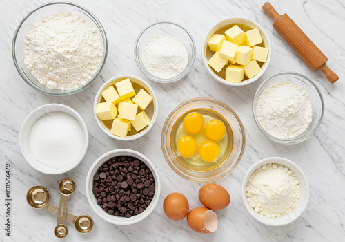 A variety of basic baking ingredients, such as flour, butter, eggs, sugar, and chocolate chips, served in bowls on a marble countertop