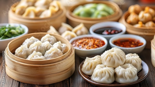 A variety of delicious dumplings and sauces served in bamboo steamers and bowls, showcasing Asian culinary artistry.
