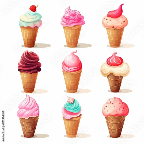 A variety of delicious ice cream flavors in waffle cones, including chocolate, vanilla, and strawberry, isolated on a clean white background. Perfect for a refreshing summer treat or dessert.