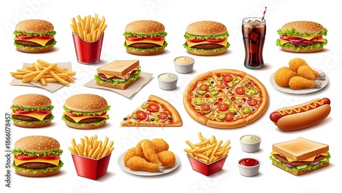 A variety of fast food items including burgers, fries, pizza, and hot dogs are arranged on a white background.