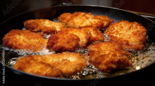 A variety of golden-brown fried foods cooks in hot sunflower oil, gently bubbling as they achieve a crunchy texture. The kitchen setting adds warmth to the culinary scene
