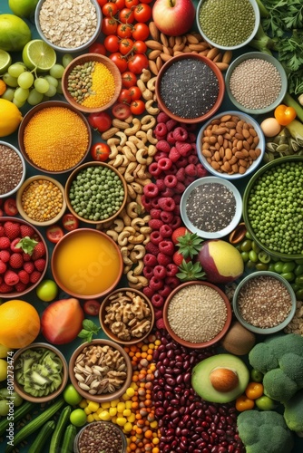 A variety of healthy foods, including fruits, vegetables, nuts, and seeds